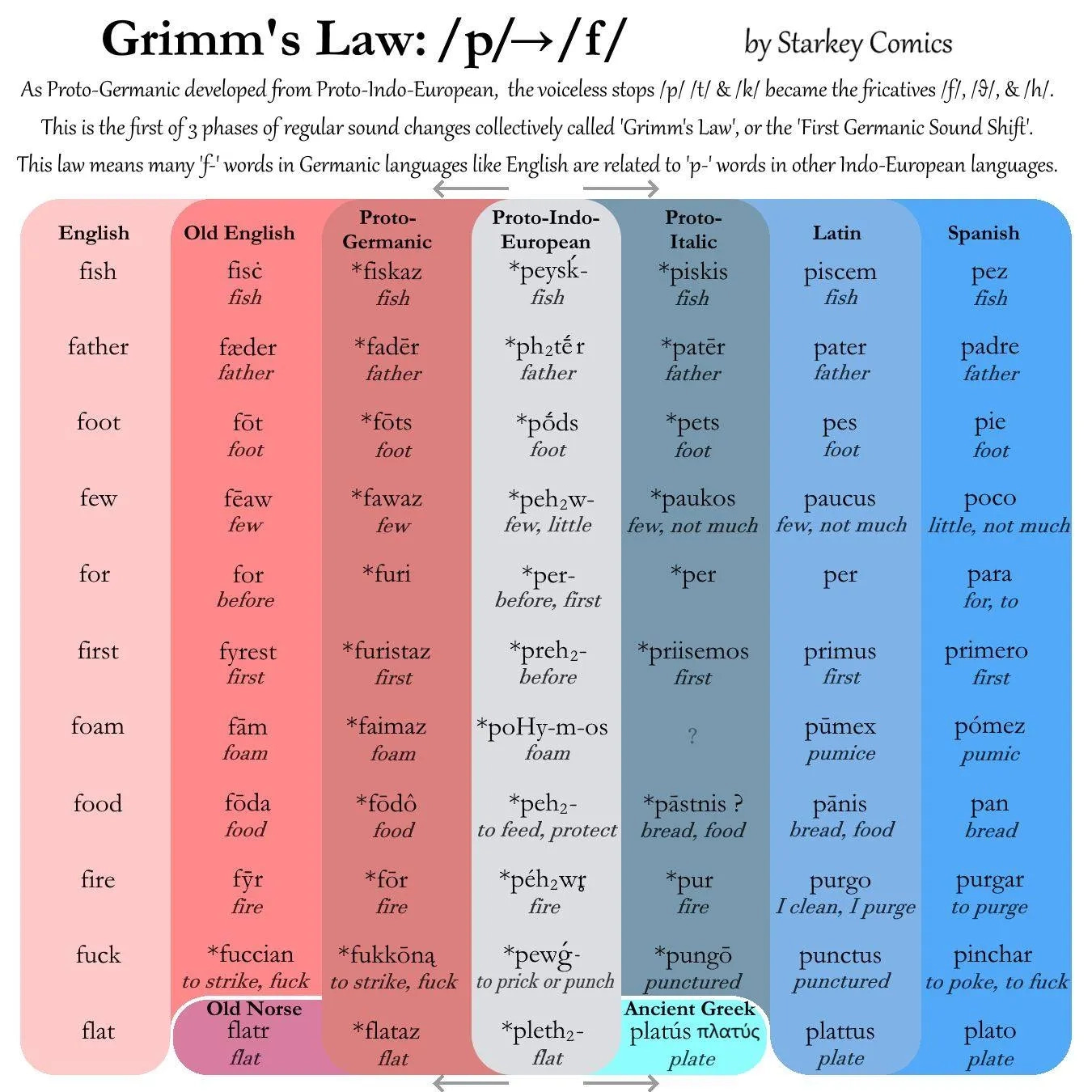 Here’s a fantastic illustration of Grimm’s Law at work from Starkey Comics: